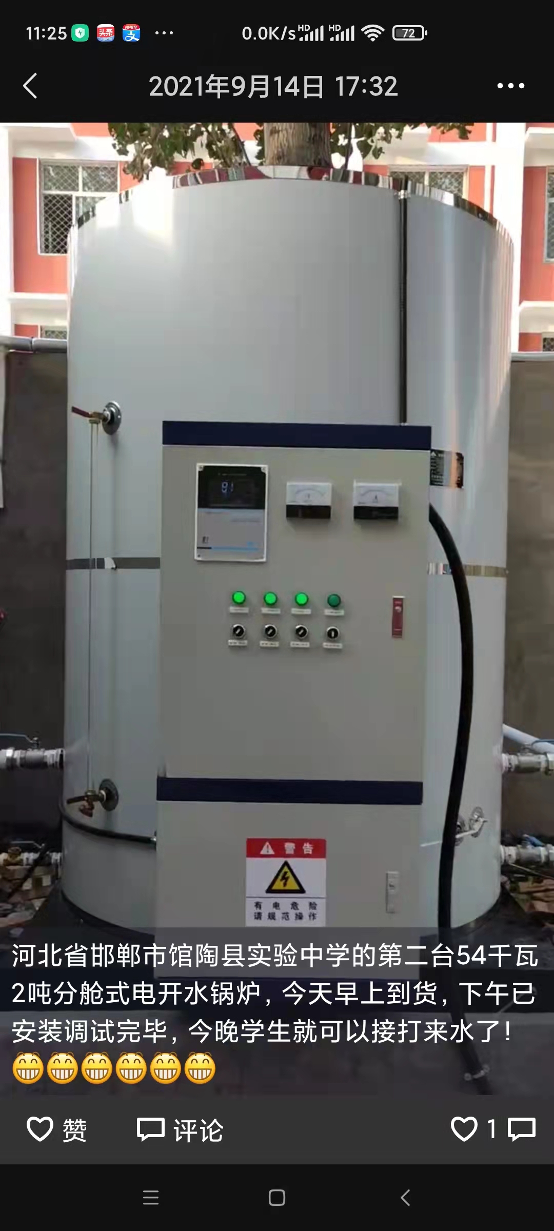 馆陶县实验中学就是原来的馆陶县第二中学,位于邯郸市馆陶县文卫街089号,2021年8月份订购两台54千瓦两吨电开水炉,分别于2021年8月29日和9月14日安装调试完毕,交付校方使用!